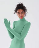 We have been working on this product for over 6 years, we finally have a fitted mock neck shirt, seamless torso, arms and fingers. It features a 5 inches seam on the shoulders to make it fit like a second skin. There's no hem on the neck or around the waist, the knitting of this shirt allows you to stretch it and wear it as a dress and even turn it into a bodysuit, or perhaps cut wherever you need without running into run issues, pun intended. For example: You can cut a slit on the wrist area if you wish to take the gloves off. We leave it up to you.