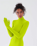 We have been working on this product for over 6 years, we finally have a fitted mock neck shirt, seamless torso, arms and fingers. It features a 5 inches seam on the shoulders to make it fit like a second skin. There's no hem on the neck or around the waist, the knitting of this shirt allows you to stretch it and wear it as a dress and even turn it into a bodysuit, or perhaps cut wherever you need without running into run issues, pun intended. For example: You can cut a slit on the wrist area if you wish to take the gloves off. We leave it up to you.